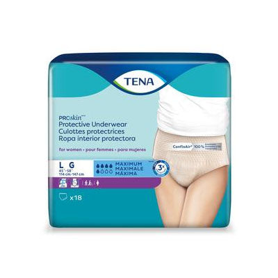 TENA ProSkin™ Protective Incontinence Underwear for Women is designed to give you the look and feel of real underwear in an attractive cream color while providing maximum absorbency. Effective leakage and odor protection plus super-absorbent polymers help lock away urine moisture. Unlike regular adult diapers, TENA Proskin Briefs are designed to give you more comfort and confidence. ConfioAir® Fully Breathable Technology helps maintain skin’s natural moisture balance with Triple Protection for dryness, softness and urine leakage security. The soft curved leg elastics ensure a secure and comfortable fit. Ideal for everyday use, for moderate surge incontinence to heavy urine leakage protection.