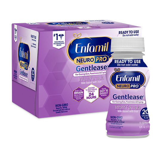 Gentlease formula is for gassy, fussy babies and is clinically proven to reduce fussiness, crying, gas and spit-up within 24 hours of use. Enfamil NeuroPro Gentlease has brain building Omega 3 DHA in an amount global experts recommend. So you can get brain-building nutrition and relief from fussiness, crying, gas and spit-up from the formula brand that's #1 recommended by pediatricians. It offers complete nutrition for babies through 12 months, easy-to-digest proteins, and vitamins and minerals for immune health.