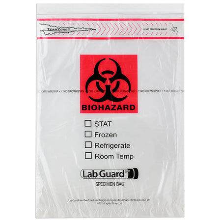 Lab Guard® brand specimen transport bags provides convenient, easy-to-use, cost-saving features you just can't get with any other bag in a range of combinations. Choose below from single zip and liquid tight double zip closures, standard or cost saving destroyable biohazard symbol, TearZone® EZ open feature or NO TearZone, paperwork pouch flap or NO flap, STAT+Temp or just Temp selector boxes and more!