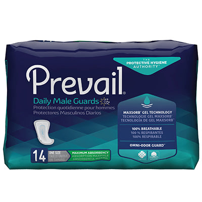 Prevail® Male Guards are body-shaped pad inserts with cloth-like outer fabric designed for stress and urge incontinence. Featuring the Target Acquisition Zone and the Blue Stay-Dry Strip, liquid is quickly wicked and locked away from the skin for ultimate skin dryness, leakage protection and odor control. With a full-length adhesive strip for secure anchoring, Prevail® Male Guards offer the ultimate in discretion and protection.